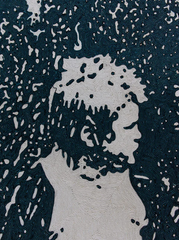 From up close the ‘handwriting’, or style of the (male) embroiderers that created the work dominates the images. A twisting play of lines shows how the work is made, while distorting the image till it is nearly unrecognisable, and even vaguely reminiscent of mystical and abstract Aboriginal patterns. But once seen from a distance, the images and compositions become familiar once again.
