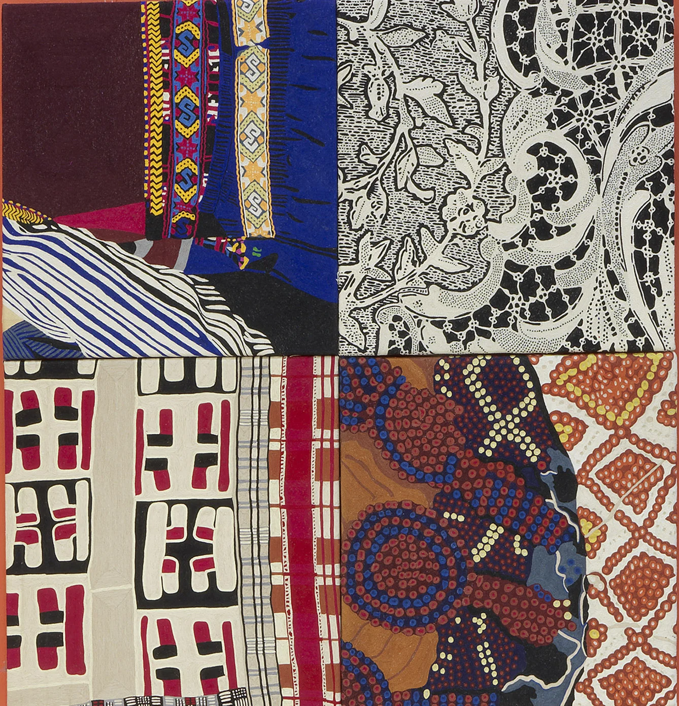 Each individual panel shows a powerful (textile) image from a particular culture. These images have been selected from motives in different kinds of daily life materials, like umbrella’s, curtains, tablecloths, hats, shawls and flags, but in such a way that the original context is not traceable. The original composition and colours have been maintained in the final image, nothing has been added by the artist. This makes the images true ambassadors of these cultures. The viewer may not always recognise the image immediately but he will feel the impact of the culture directly.