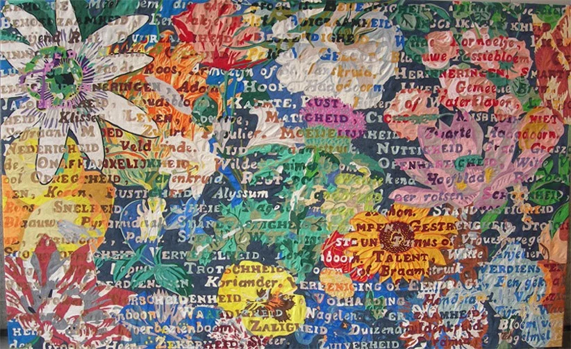 In 2004, Barbara was commissioned to create five tapestries for five different municipalities in the Westland region (south-west of Holland). Each carpet was placed in the town hall of the concerning municipality. The tapestries were executed in hand embroidery and hand-woven Gobelin, and represent important aspects of the region. Flowers, greenhouses and the history of trading are imbedded in the twirling compositions.
